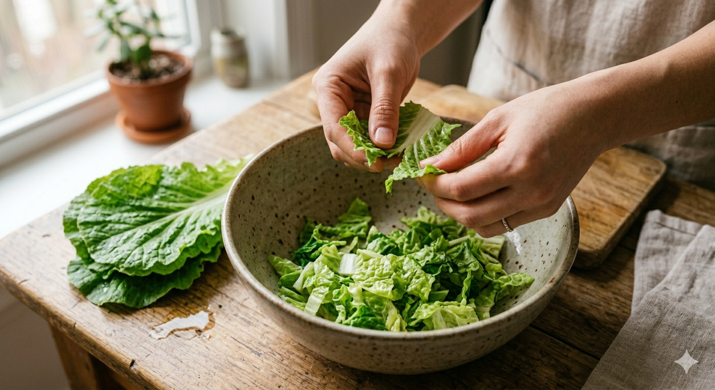 봄동은 칼로 잘게 써는 것보다 손으로 큼직하게 찢는 편이 식감이 더 살아납니다.